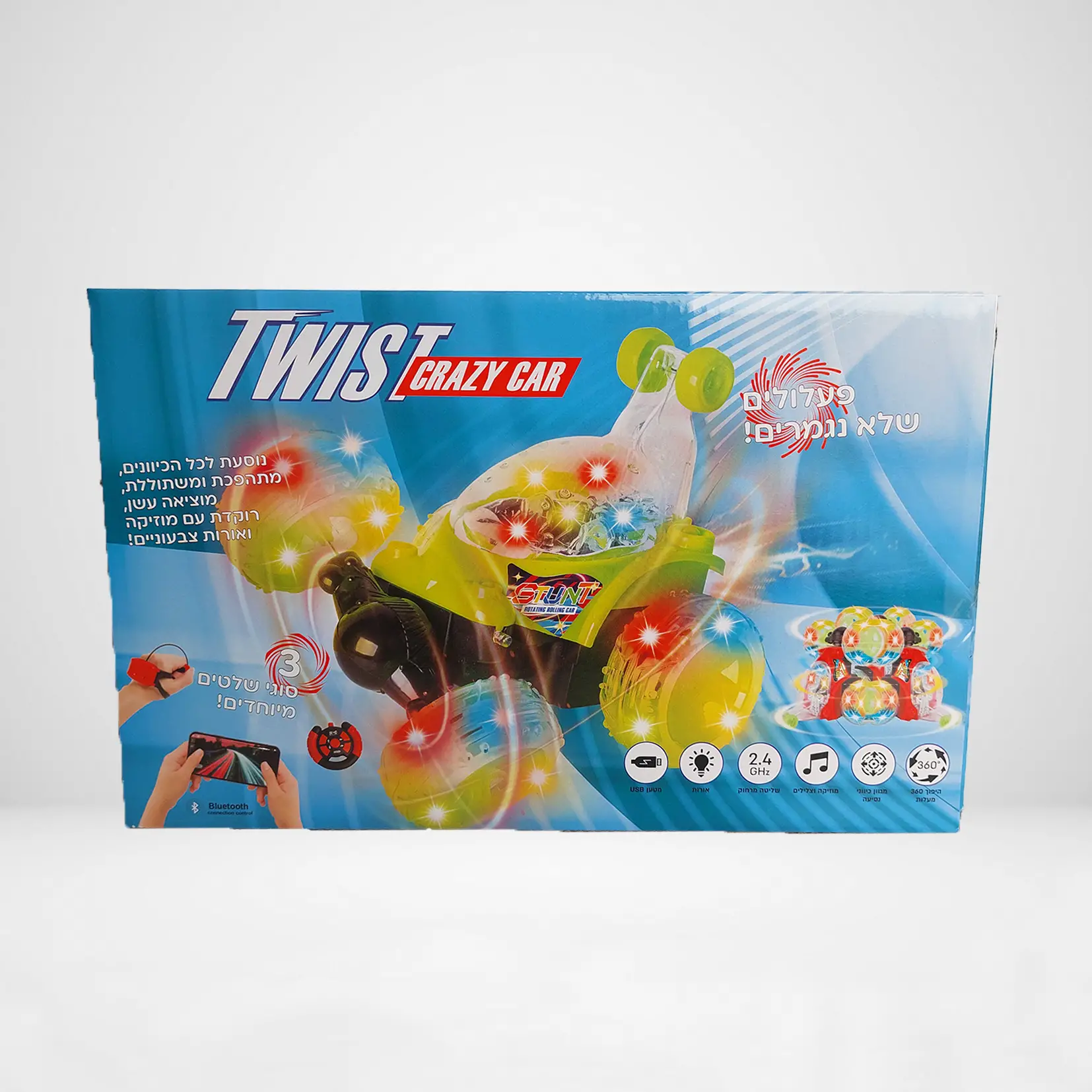 מכונית פעלולים כולל 3 סוגי שלטים- שלט שעון, שלט באפליקציה (דרך הטלפון) ושלט רגיל.